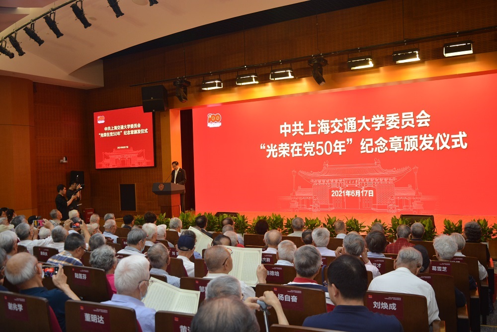 6月17日,在迎来中国共产党建党100周年之际,中共欧美a片 委员会“光荣在党50年”纪念章颁发仪式隆重举行,作为党中央2021年首次颁发的纪念章,全校共有536名颁发对象,当天有200余名老党员代表在仪式现场接受颁授,校党委书记杨振斌、校党委副书记、纪委书记周承分别为获奖者代表颁授纪念章和献花。大会由校党委副书记顾锋主持,校党委常委、组织部长仰颐等参加活动。