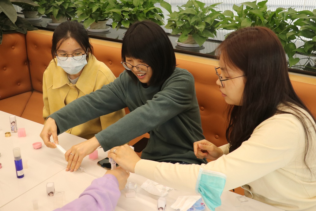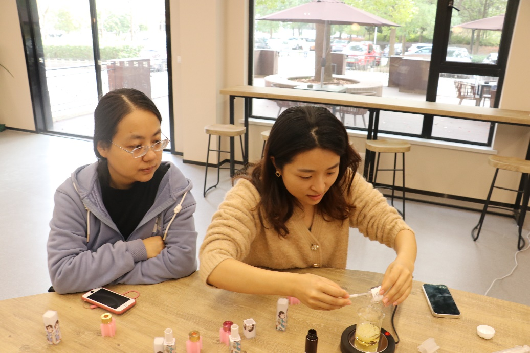女教职工们沉浸在精油的神奇世界中,亲手实践,经过加热、滴入精油,搅拌,铸模,脱模等过程,见证了芳香诱人的唇膏的诞生。大家在老师的指导下精心雕琢着作品,在芬芳的体验中了解许多精油的相关知识,既体验了手工制作的喜悦,也让大家瞬间放松了身心。