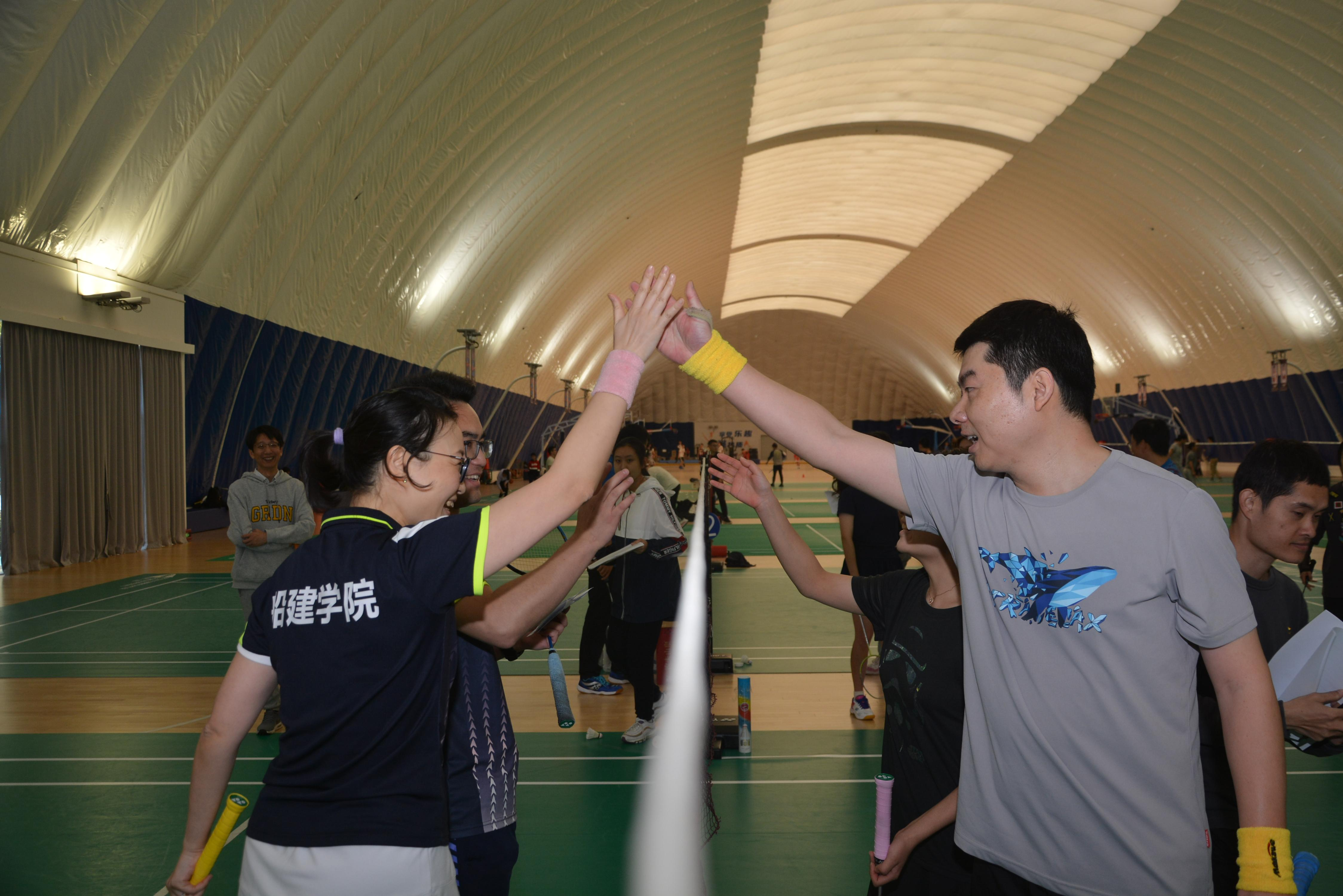 之后是“五羽轮比”趣味赛,由张卫刚、王喜芳、薛鸿祥和赵金城四位老师领队,现场招募选手组成四支五人组队伍,按照“五羽轮比”规则,一方获得10分后双方各替换一名选手进入下一局,以此类推,直到赢得50分。经过激烈的角逐,由薛鸿祥和张卫刚带领的队伍分别获得趣味赛第一、二名,赵金城和王喜芳带领的队伍分别获得三、四名。