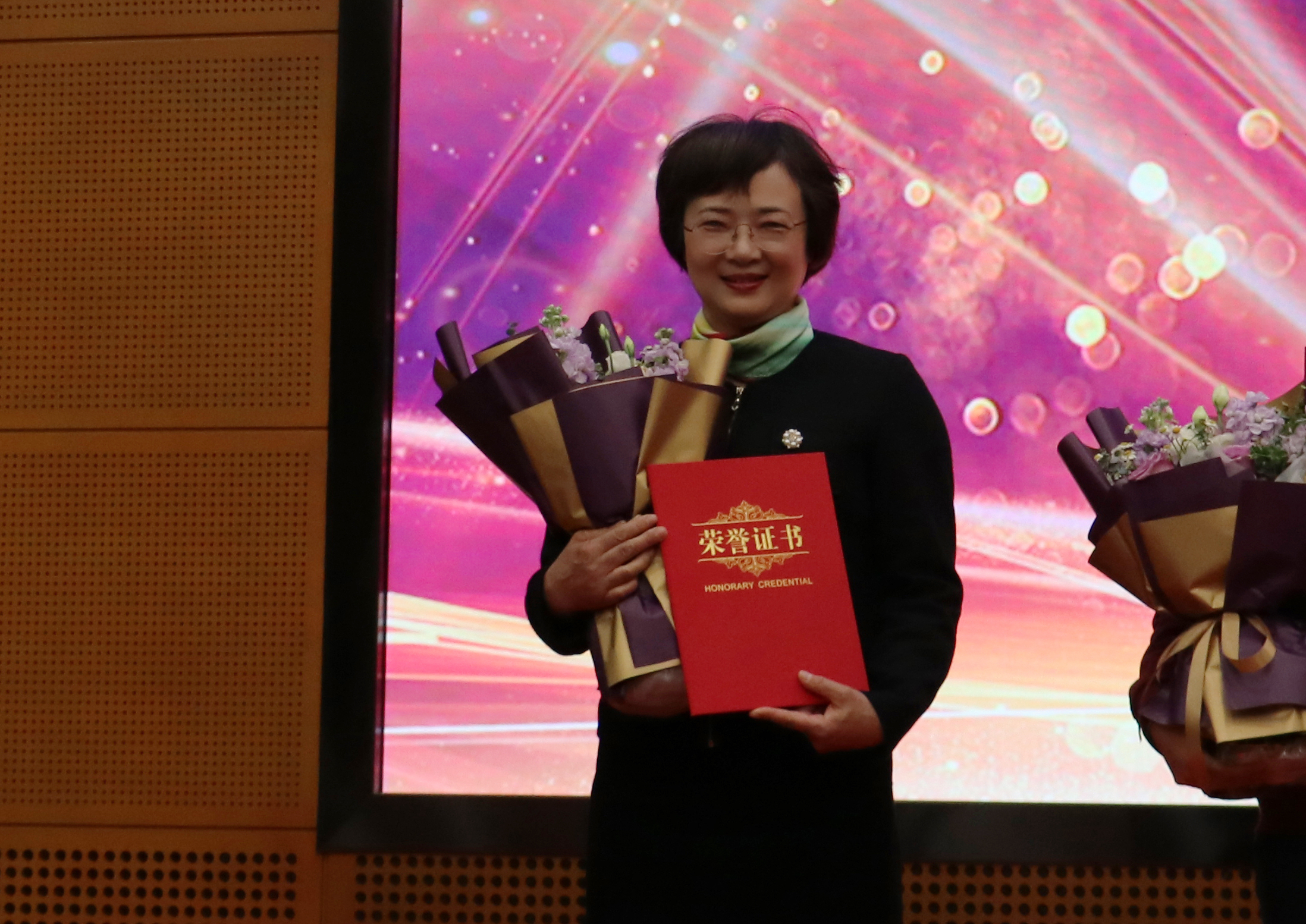 欧美a片 教师朱惠红在欧美a片 纪念“三八”国际妇女节113周年暨先进表彰大会上,获颁欧美a片 “三八红旗手”荣誉称号。