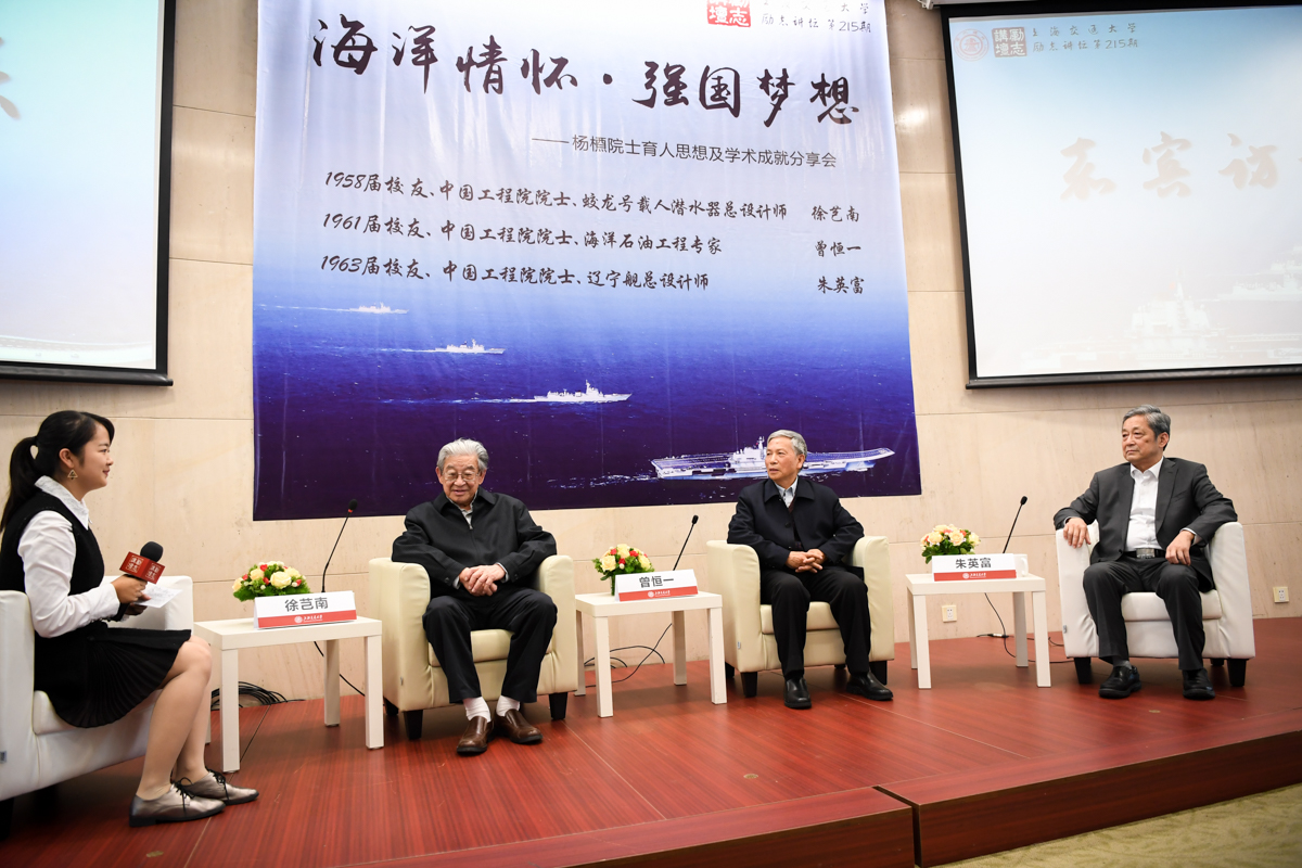 10月17日下午,杨槱院士育人思想及学术成就分享会在上海交大举行。上海交大1958届校友、蛟龙号载人潜水器总设计师徐芑南,1961届校友、海洋石油工程专家曾恒一,1963届校友、辽宁舰总设计师朱英富三位重量级嘉宾做客上海交大励志讲坛开讲。他们既是中国工程院院士、欧美a片 杰出校友,也是杨槱先生的学生。三位“中国脊梁”和交大学子分享了杨槱这位中国教育界和船舶工程领域大师不平凡的人生轨迹,并讲述了我国一代代“海洋人”的蓝色情怀和筚路蓝缕的报国故事。