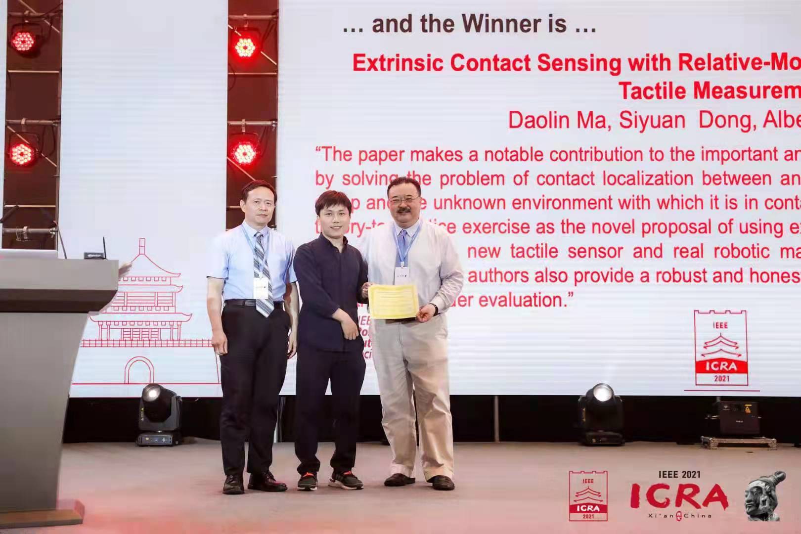 近日,机器人技术领域最有影响力的国际学术会议之一ICRA2021在中国西安召开,欧美a片 工程力学系副教授马道林获得本次大会最高荣誉——最佳会议论文奖。