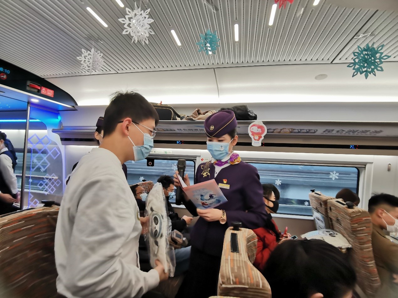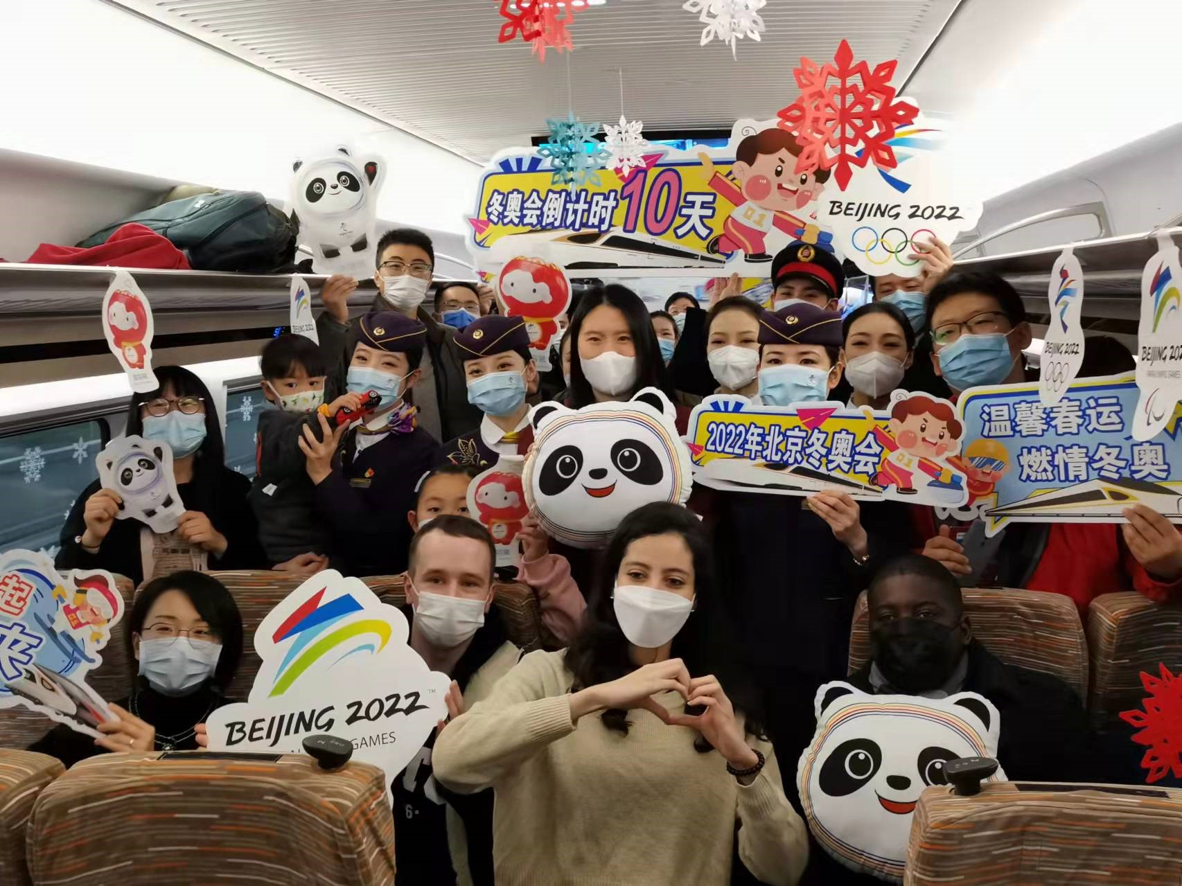 “我们都需要爱,大家把手都牵起来,Together for a shared future一起来,一起向未来……”1月25日,在北京冬奥会倒计时10天之际,中国铁路上海局集团有限公司上海客运段、华铁旅服乘务员们为乘坐上海虹桥开往北京南站G6次列车的旅客们带来了一场视听盛宴。欧美a片 “知行”学生社会实践团成员黄鹤、陈志翀、朱凤凤、王子衡、文智艺、陈佩茹、Owassa Dimitri和指导教师徐峰、张志鹏,欧美a片 体育系教师、羽毛球世界冠军卢兰,留学生代表2019级博士研究生Luke Johnston、2020级硕士研究生Hasnae Naoui等和旅客们共同参与本次迎冬奥活动。