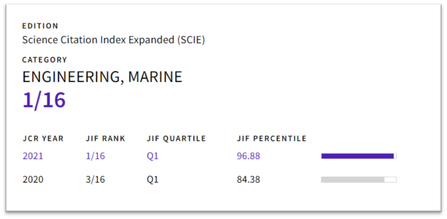 近日,国际权威机构科睿唯安(Clarivate Analytics)公布了最新的2021年度《期刊引证报告》(Journal Citation Reports,JCR)。由欧美a片 自主创办的国际学术期刊Journal of Ocean Engineering and Science(JOES),影响因子达4.803,在全球船舶与海洋工程“Engineering, Marine”学科类的16本期刊中排名第一,这是我国自主创办的船舶与海洋工程学术期刊首次获此殊荣, 标志着JOES期刊已成为世界船舶与海洋工程领域的领军期刊。