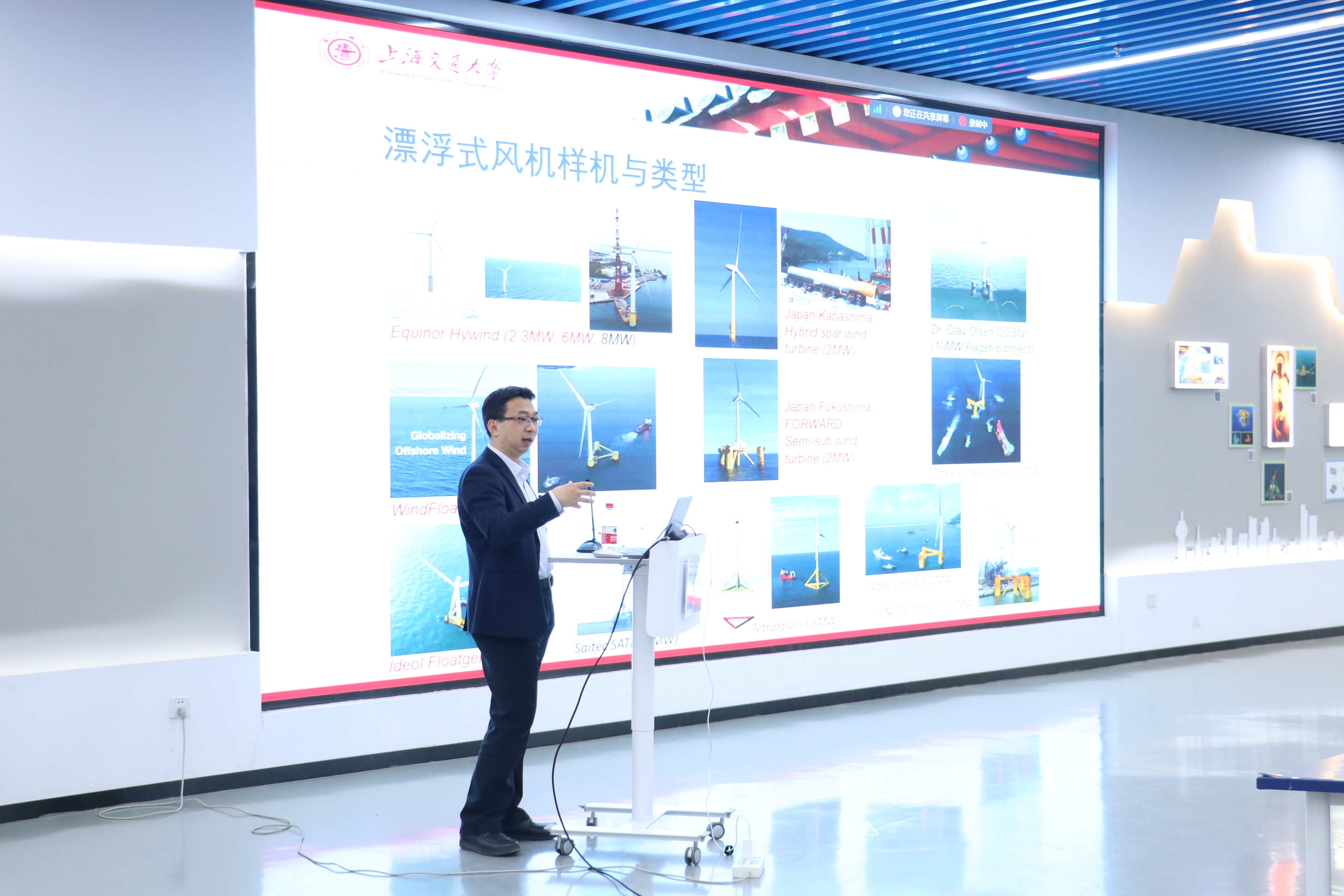 在报告中,高震教授指出,在全球减排与积极利用可再生能源的背景下,海上风电迎来了大规模发展的浪潮,漂浮式风机也处于商业化发展的前期。高教授从海上风机的发展情况、工作原理、基础结构类型与设计要求谈起,详细介绍了海上风机空气与水动力载荷响应耦合计算、一体化设计方法与计算软件。并结合其在挪威科技大学的科研工作,重点讨论了漂浮式风机在目前单机大型化趋势以及风场大规模建设要求之下在总体设计、载荷响应耦合分析、风机与风场控制、机械结构数值模拟及故障诊断等方面的挑战。之后介绍了固定式与漂浮式风机在安装与运维方面的工作与挑战,主要包括自升式安装船与浮式安装船风机叶片吊装数值建模分析与叶片运动控制,海上安装窗口期与安全性评价,波浪短期、长期预报与不确定性分析,以及用于运维的、基于波浪与船舶运动短期预报的运动补偿前馈控制方法。