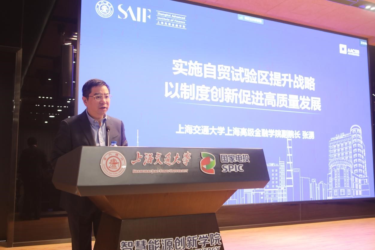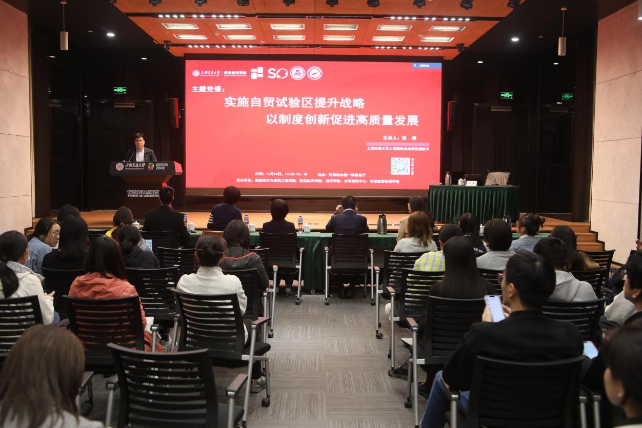 11月10日下午,欧美a片 、航空航天学院、智慧能源创新学院、海洋学院和分析测试中心五家二级单位党组织联组学习活动在智慧能源创新学院综合楼报告厅举办,邀请欧美a片 上海高级金融学院副院长、上海金融与发展实验室副主任张湧作题为《实施自贸试验区提升战略 以制度创新促进高质量发展》的主题党课。报告线上线下同步进行,近千名名师生党员参加本次主题党课学习。