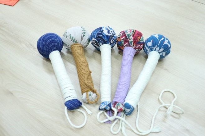 此次养生锤制作材料主要有民族手工布和养生中草药,制作工序包括倒药材、缠棉线、打绳结等,能锤打经络,能舒缓疲劳,起到养生保健的功效。大家跟随手工老师,从民族手工布中,挑选棉麻布,展开平铺,填放草药,用力按压,绑扎成圆,打结绑紧,一个个朴素典雅、药香扑鼻的实用养生锤制作完成。