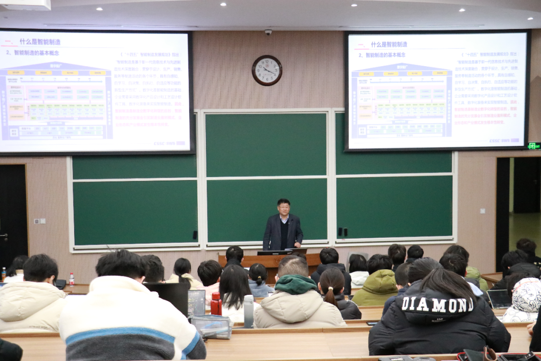 王琦董事长是国产大型邮轮工程建造项目总指挥,深耕船舶制造行业多年,具有丰富的工程项目经验,曾承担多项国家重大科研项目,获得国家科技奖进步特等奖等荣誉。课上,王琦围绕制造行业智能制造的概念和面临的共性问题,结合船舶制造特点,提出了船舶智能制造的发展路径。王琦指出,船舶智能制造是未来造船发展的必然选择,并结合外高桥造船的工程案例深入浅出地带领同学们分析船舶行业发展趋势。在交流讨论环节中,王琦与同学们就智能化技术以及从事相关研究需掌握的基础知识和专业技能等开展充分探讨,就我国船舶智能制造领域当前在国际上的发展形势和对未来行业从业影响等方面进行了深入交流。课程内容以国家重大工程为导向,增强了同学们的民族自信心,激发了同学们投身行业的热忱。