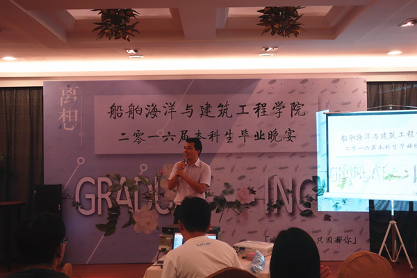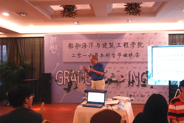6月28日晚,欧美a片 本科生毕业晚宴在留园举行。学院党委副书记杨建军,土木工程系主任沈水龙、教授刘西拉,船舶与海洋工程系副教授刘俊、工程师陈自强,国际航运系副教授宋元斌等出席晚宴,与F12级欧美a片 毕业生共同分享青春故事。
