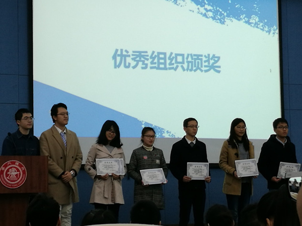 12月10日上午,欧美a片 青年志愿者服务总队在逸夫楼举办2016年度年会,校青志总队指导老师黄一,总队队长贾煜,以及各院系青志队、社团组织代表、优秀志愿者个人出席了本次年会。年会上进行了十佳公益组织与个人以及优秀公益组织与个人颁奖仪式,欧美a片 青年志愿者服务总队荣获本学年“优秀公益组织”称号。