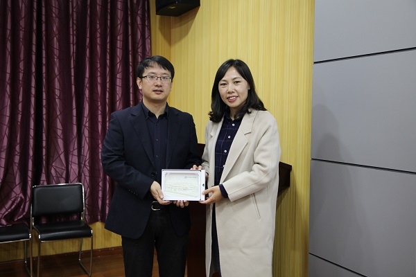 夏利娟、宋续明向建工学院赠送了交大纪念铜牌,希望双方友谊长存。
