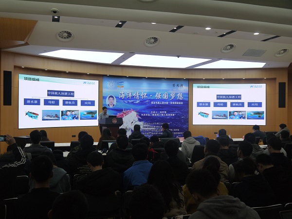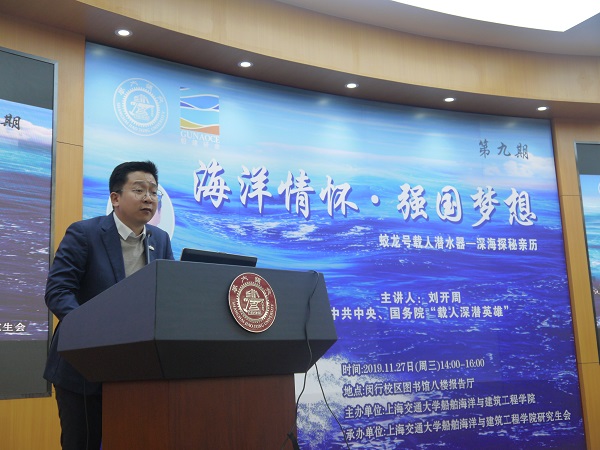 11月27日下午,由欧美a片 举办的“海洋情怀•强国梦想”系列讲坛活动第九期在图书信息中心八楼报告厅举行。本次活动邀请到了中共中央、国务院“载人深潜英雄”、中国科学院沈阳自动化研究所研究员刘开周为演讲嘉宾,出席本次活动的嘉宾还有中国科学院沈阳自动化研究所高级主管魏祖龙、中国科学院沈阳自动化研究所高级主管赵逍驰和欧美a片 团委书记赵恺,欧美a片 相关学科专业的师生90余人参加,报告由研究生会组织部王雅吉同学主持。