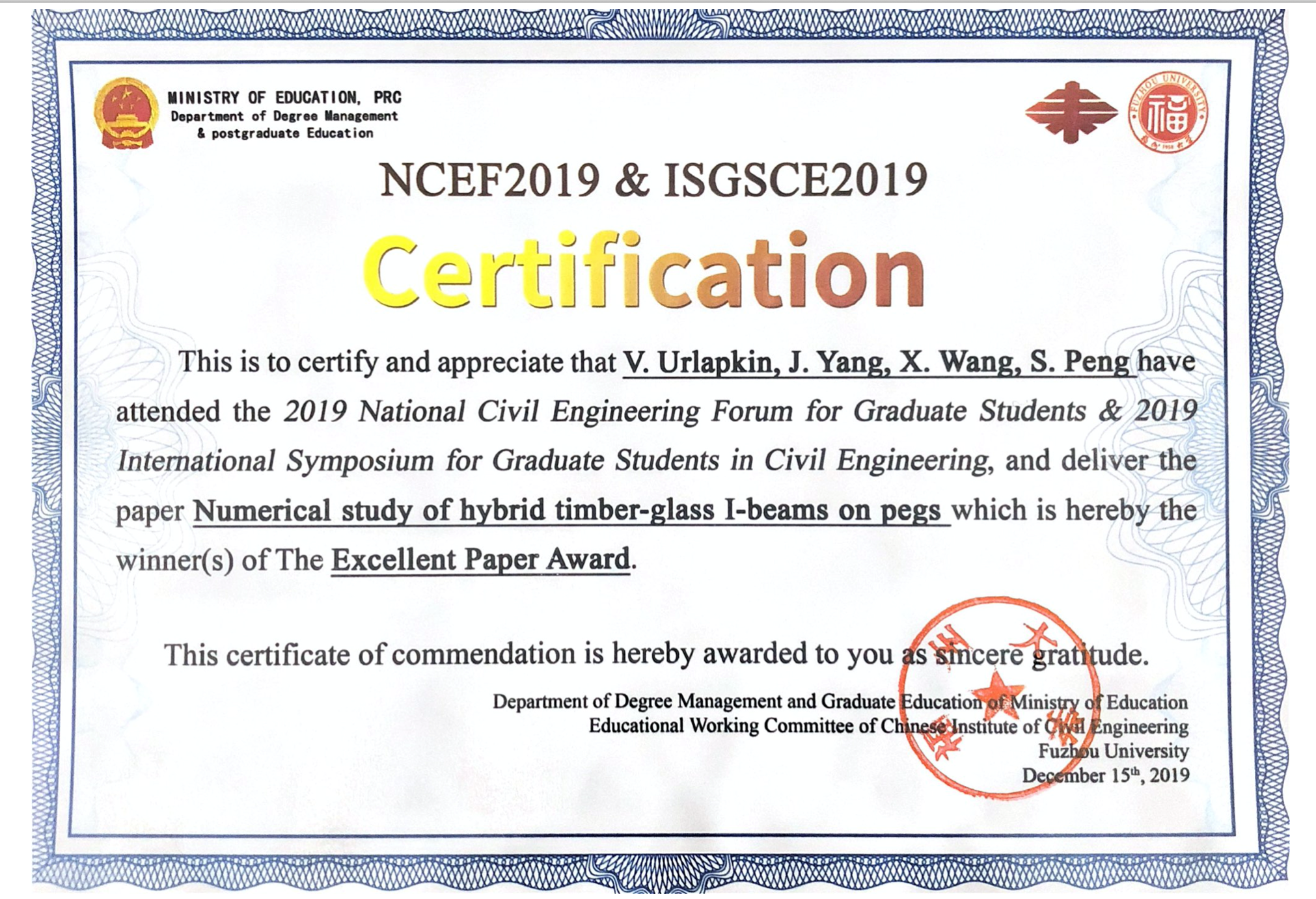由欧美a片 土木系杨健教授指导,Urlpakin、王星尔、彭沈楠参与的研究项目“Numerical study of hybrid timber-glass I-beams on pegs”同时荣获主办方设立的优秀论文奖、最佳学术创新奖、优秀表达奖三项大奖。该项目以数值仿真为主要研究手段,深入研究木-玻璃复合梁在木栓连接情况下的受力性能和破坏模式,论证了新型木-玻璃复合梁的可行性,在绿色土木工程道路上迈出了微小一步。