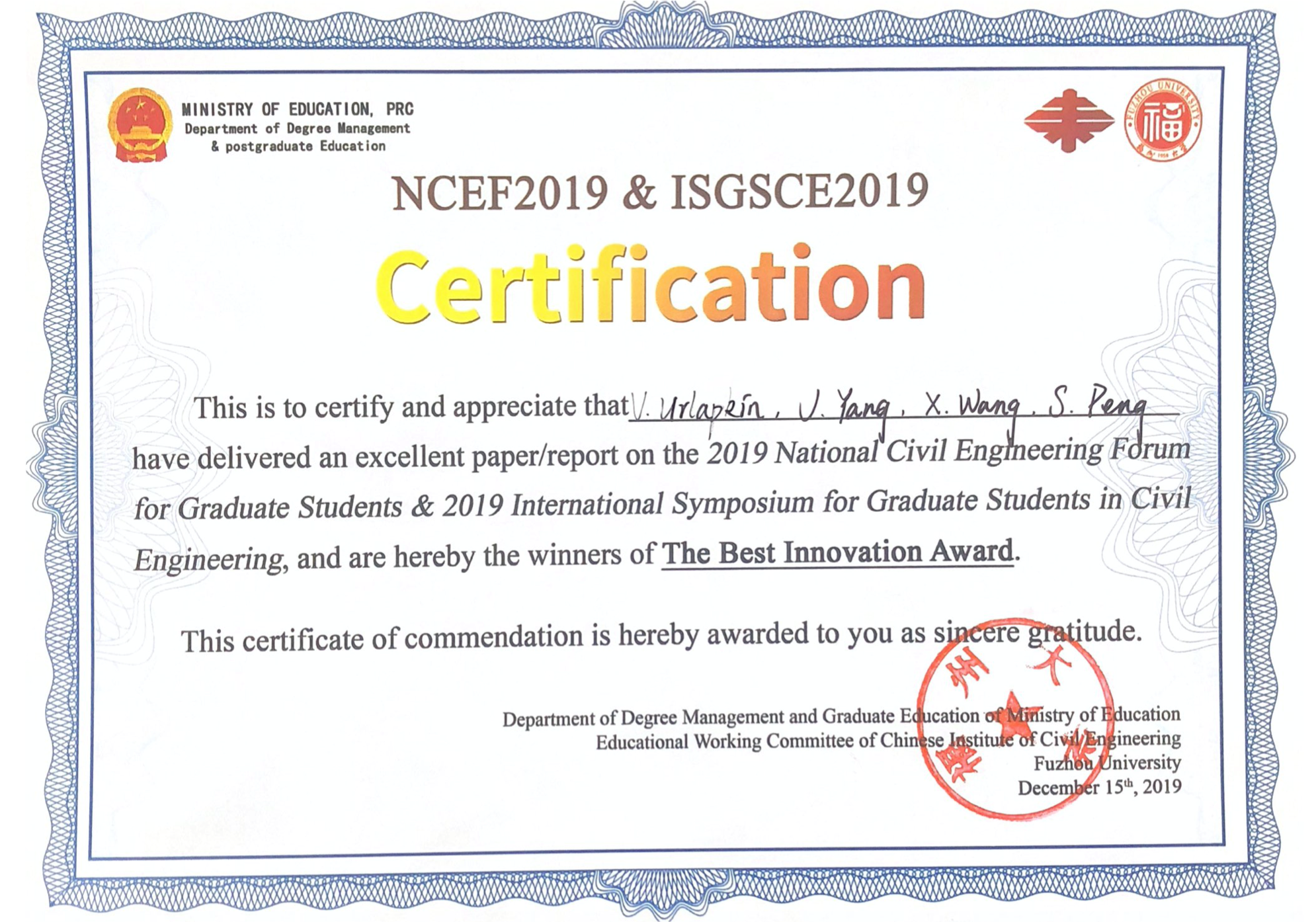 2019年全国土木工程研究生学术论坛(NCEF)暨2019年土木工程研究生国际交流会(ISGSCE)于2019年12月13至15日在福建省福州市召开。本次学术论坛邀请部分院士和专家学者,邀请国外知名专家和国内外土木工程领域优秀博士和硕士研究生参加,以“智慧土木工程的发展与挑战”为主题进行深入的学术交流与研讨。