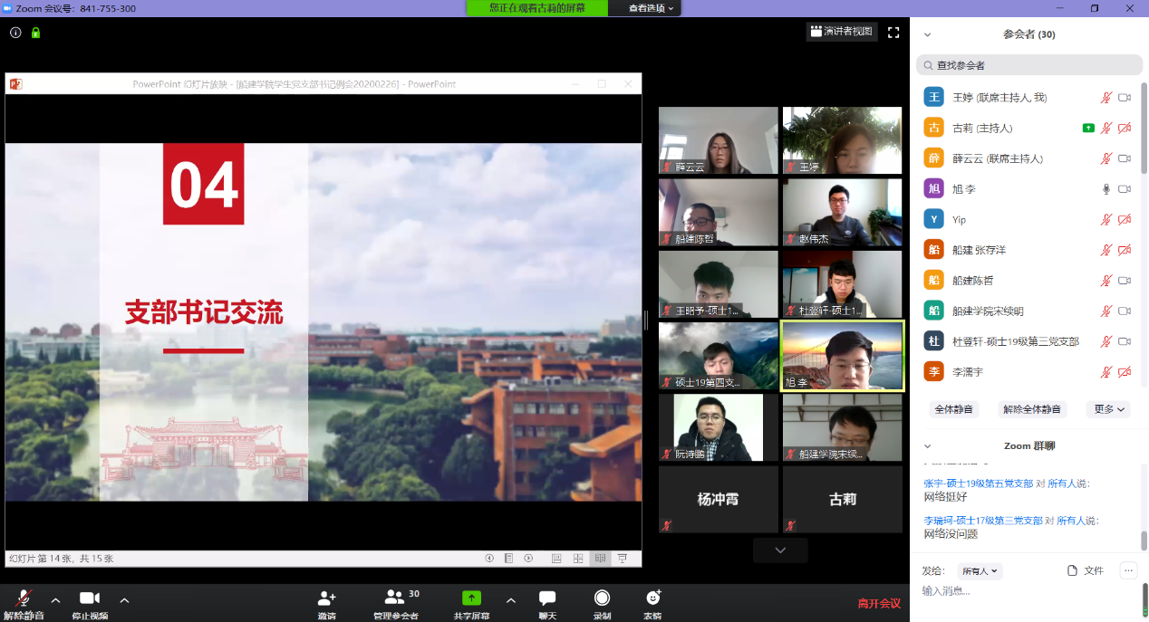 海洋工程国家重点实验室博士生党支部书记李旭和本科第一党支部书记朱子扬分享了疫情期间支部工作开展情况,为其他支部提供思路和方案。