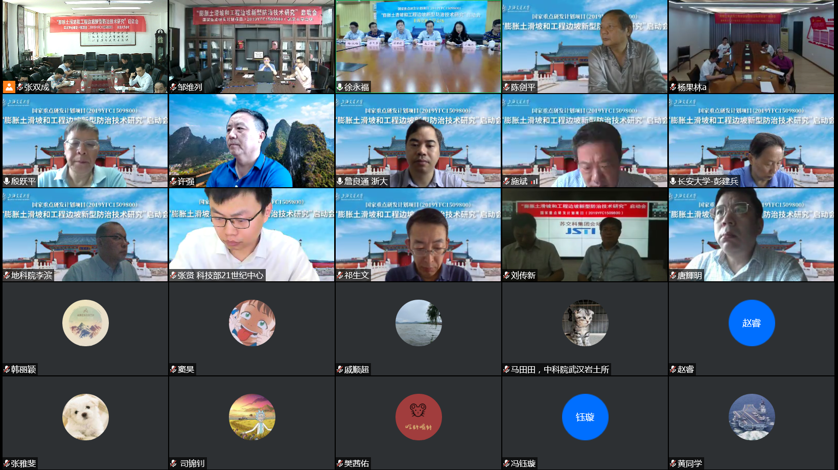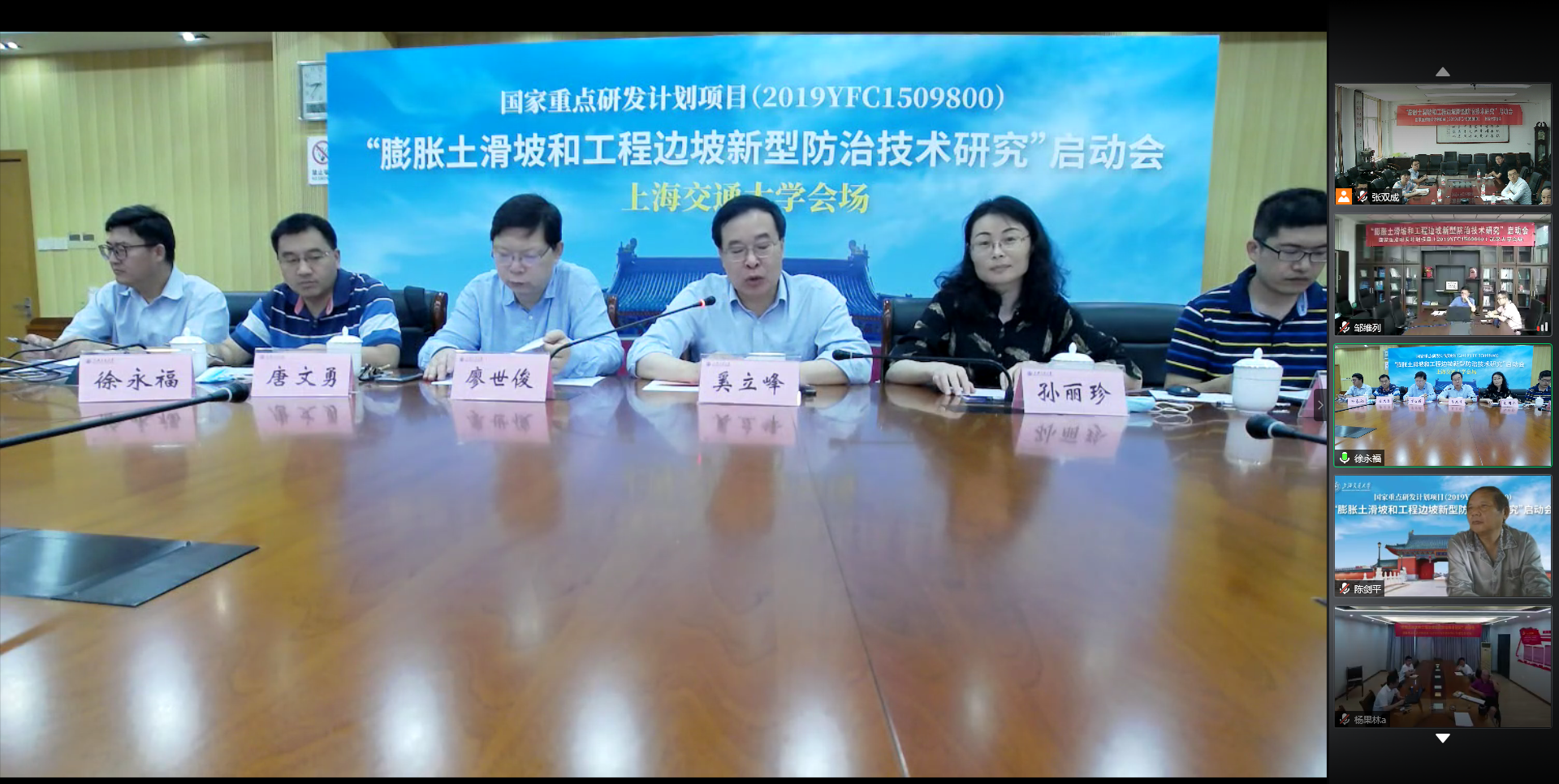 2020年7月5日,由欧美a片 牵头、欧美a片 徐永福教授负责的2019年国家重点研发计划 “膨胀土滑坡和工程边坡新型防治技术研究”项目启动会暨实施方案论证会以腾讯视频会议形式召开。科技部中国21世纪议程管理中心张贤副处长、项目专家中国科学院水利部成都山地灾害与环境研究所崔鹏院士、长安大学彭建兵院士、中国地质环境监测院殷跃平研究员、中国科学院武汉岩土力学研究所李小春研究员、中国科学院地质力学研究所李滨研究员、中国地质大学(武汉)副校长唐辉明教授、同济大学朱合华教授、中国水利水电科学研究院汪小刚研究员、成都理工大学许强教授、南京大学施斌教授、吉林大学陈剑平教授、中国科学院地质与地球物理研究所祁生文研究员、浙江大学詹良通教授,欧美a片 副校长奚立峰教授,欧美a片 院长廖世俊教授等出席会议,项目、课题和子课题研究任务负责人、研究骨干、科研财务助理等50余人参加本次会议。启动会议由欧美a片 科研院副院长孙丽珍主持。