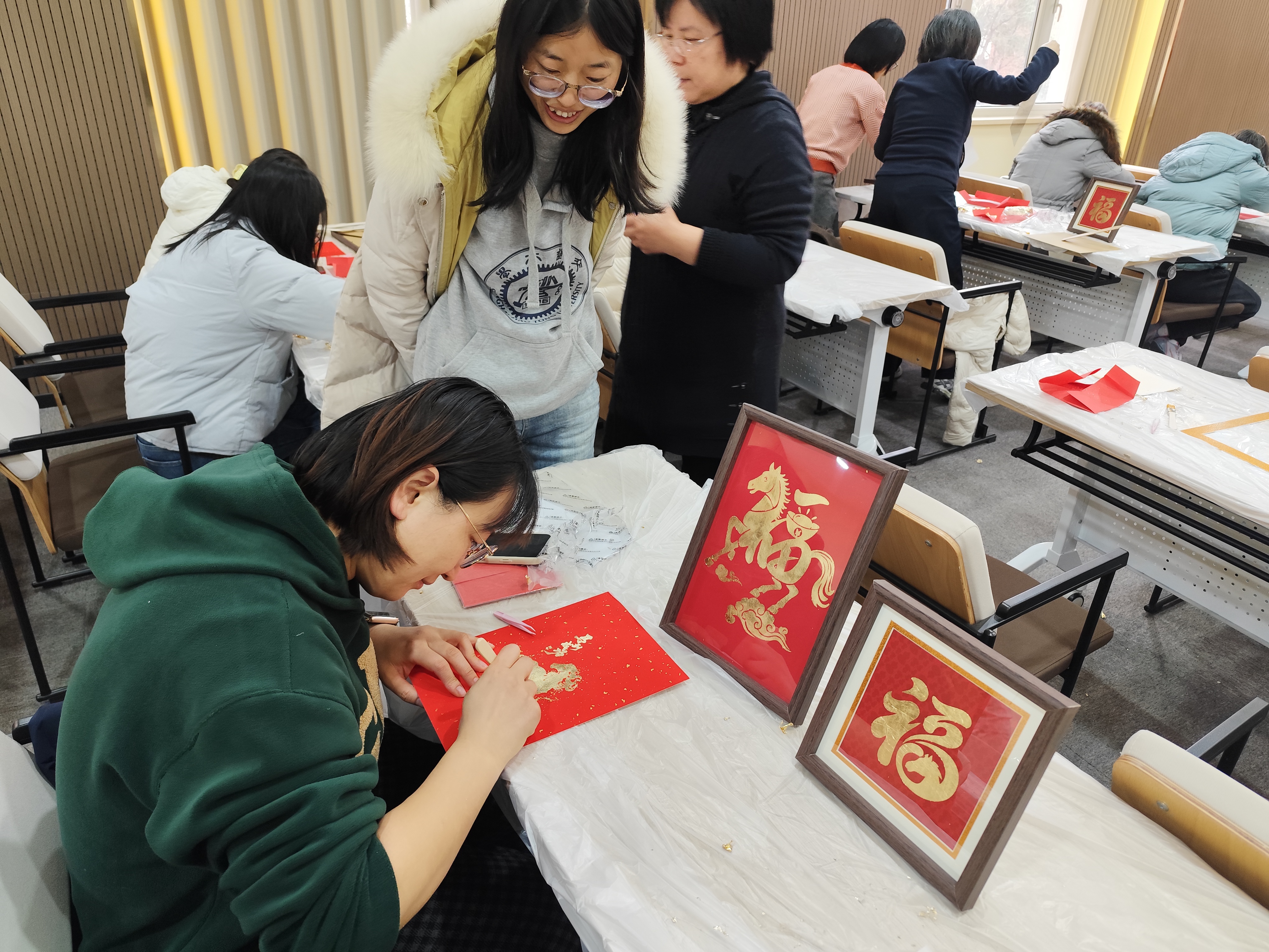 实操环节,老师们化身“金箔匠人”。贴金、扫箔、装框,金屑飞扬间,一幅幅金箔画陆续完工,“柿柿如意”“马到成功”“马上有福”等跃然纸上,金辉与笑靥交相辉映。
